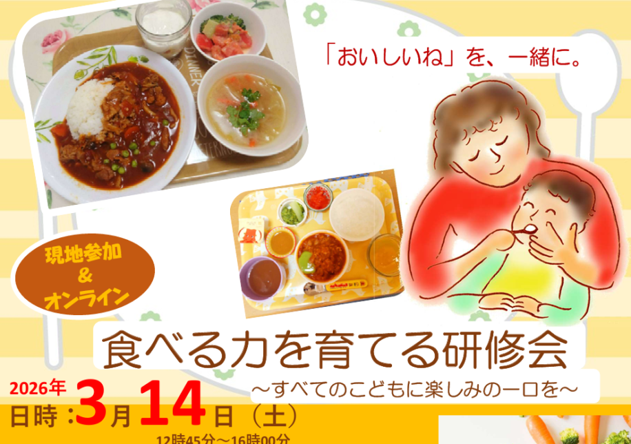 本人の思いを何よりも大切にしながら、家族や仲間との楽しい生活の中でおいしく食べる力を無理なく育てていきたいと考えています。オンライン・会場参加共に参加無料となっています。本年度最後の研修会となります。是非ご参加ください。 参加申込QRコードはチラシ裏に掲載しています。